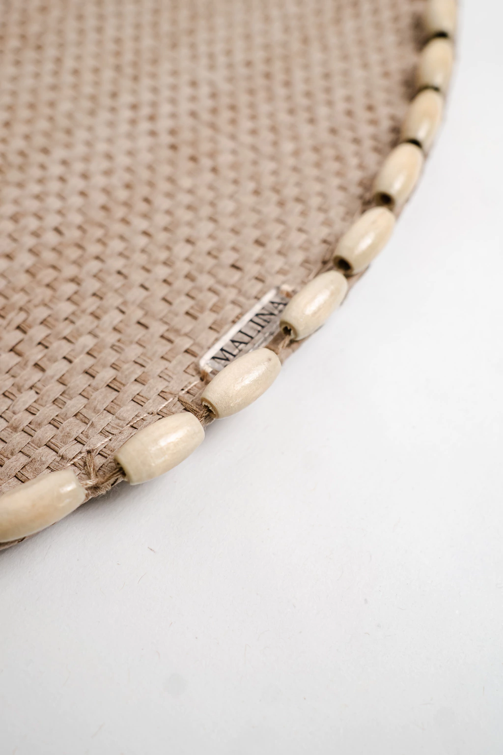 Jogo americano redondo com detalhe de miçangas ao redor da peça.