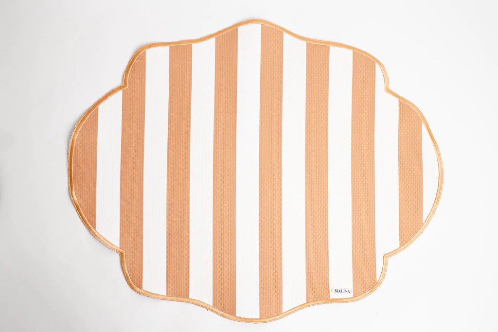 Um dos queridinhos da Malina quando o assunto é unir praticidade e beleza à mesa. Possui acabamento impermeável, o que permite a limpeza com apenas um pano úmido — e o melhor: não precisa passar! De um lado, listras no caramelo e branco; do outro, um tom caramelo liso. Dois visuais em uma só peça.