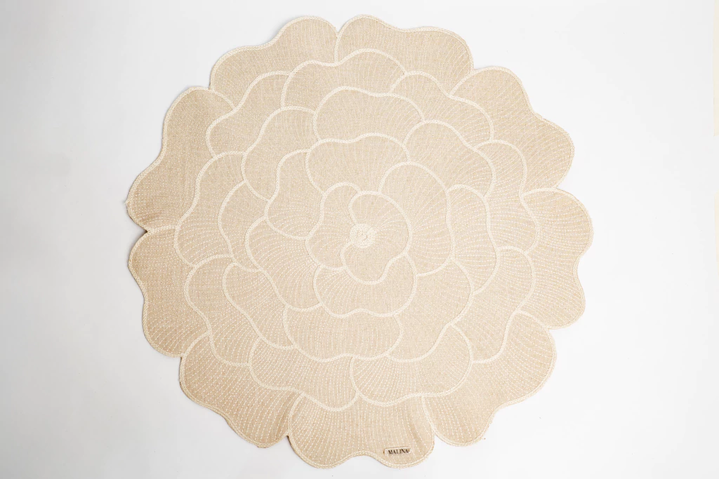 Jogo americano no tecido poli linho em formato de flor bordado